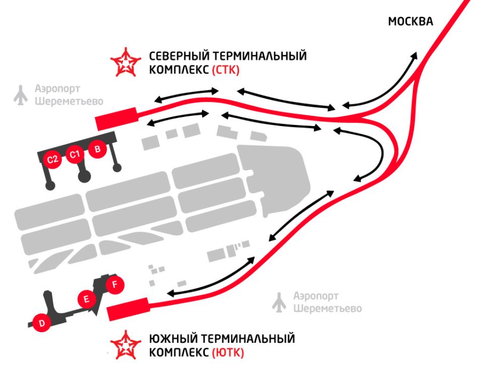 «Аэроэкспресс» из Москвы прибывает в Северный терминальный комплекс (СТК), терминалы В и С, далее он следует в Южный терминальный комплекс (ЮТК) и возвращается обратно в СТК . После непродолжительной стоянки отправляется сразу в Москву. С 10 мая Аэроэкспрессы в / из аэропорта Шереметьево будут курсировать от / до Одинцово с частотой в 30 минут.